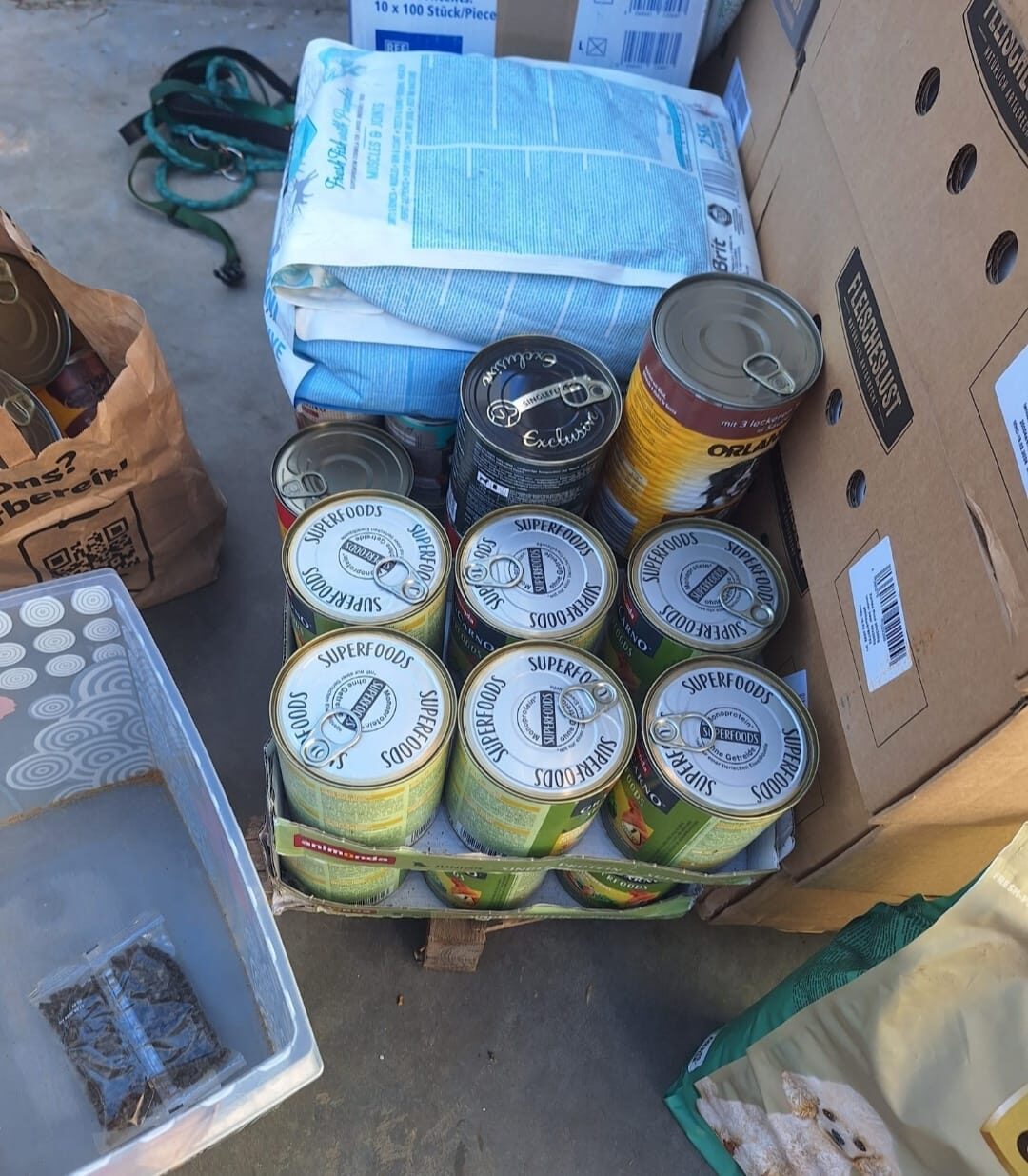 Ein Großteil der Spenden ist in Spanien angekommen. Futter, Decken, Halsbänder, Geschirre ..... und natürlich auch die Transportboxen.