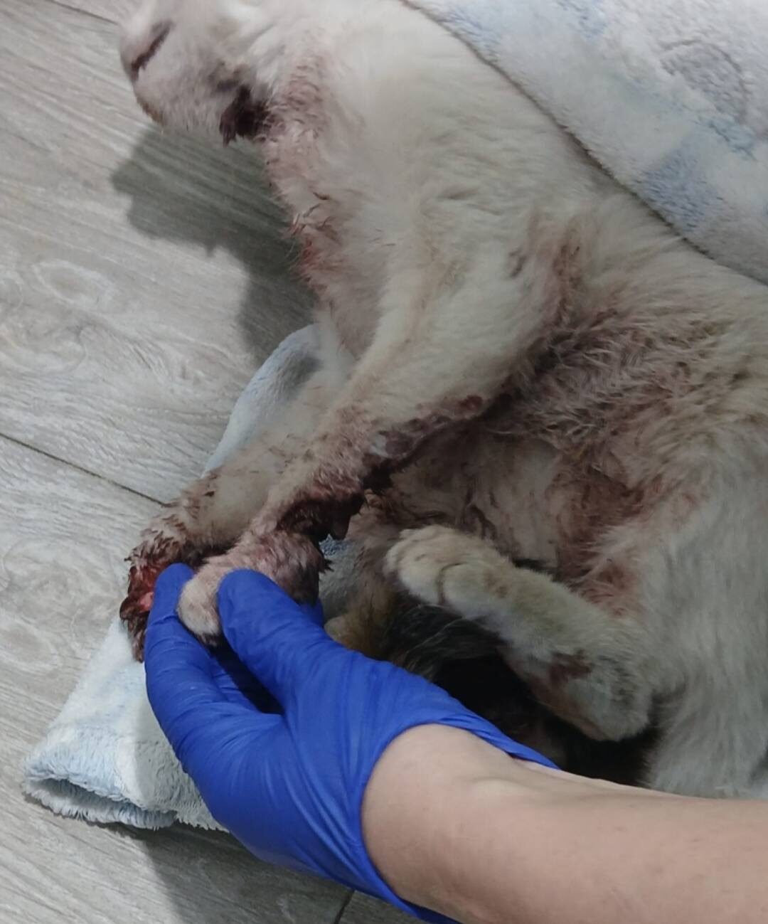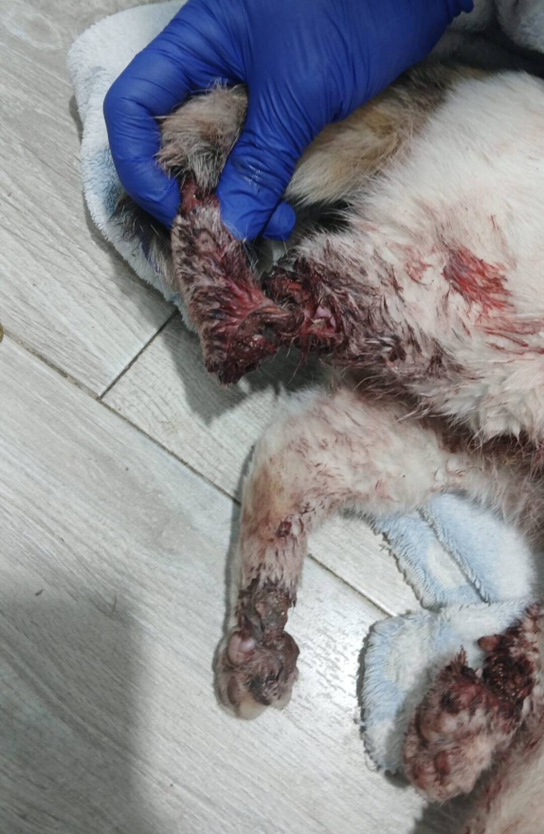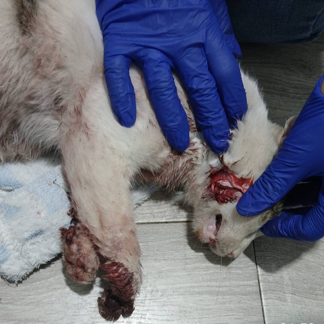 Schwerverletzt kam dieses Kätzchen in die Perrera. Ihre Beinchen müssen irgendwo eingeklemmt gewesen sein. Die Verletzungen schon so schlimm, dass zwei Beinchen teilamputiert werden mussten. Das Kätzchen ist bei der Tierärztin und wird dort versorgt.