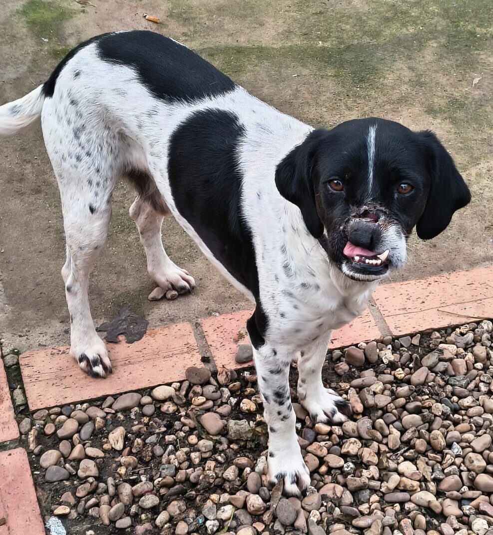 Beethoven ist eines unserer Sorgenkinder, wenn nicht DAS Sorgenkind. Als der Rüde gefunden wurde klaffte eine riesen Wunde in seinem Gesicht, Nase und ein Teil des Oberkiefers hingen nur noch an einem kleinen Stück Fleisch. Wie es zu dieser Verletzung gekommen ist, das wissen wir leider nicht. Es deutet allerdings alles darauf hin, dass es sich um Gewalteinwirkung handelt.