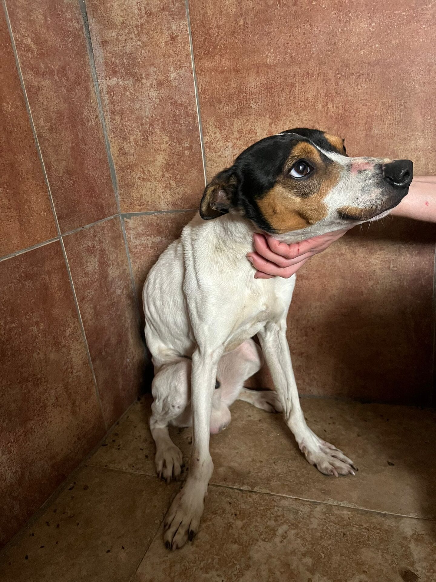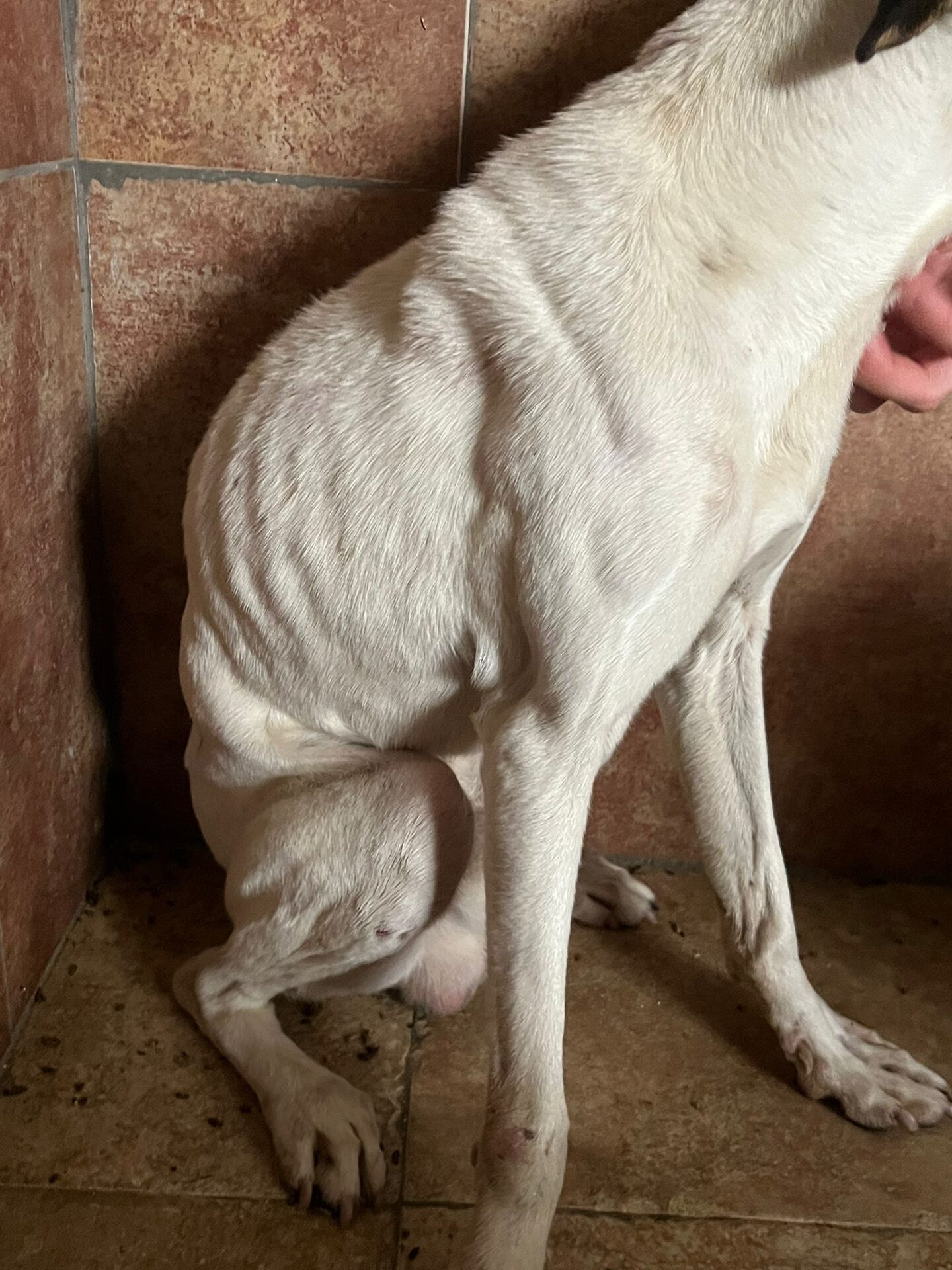 Der junge Rüde wurde an der Autobahnauffahrt gefunden. Er hatte keine Kraft und keine Hoffnung mehr, ließ sich ohne Widerstand mitnehmen.