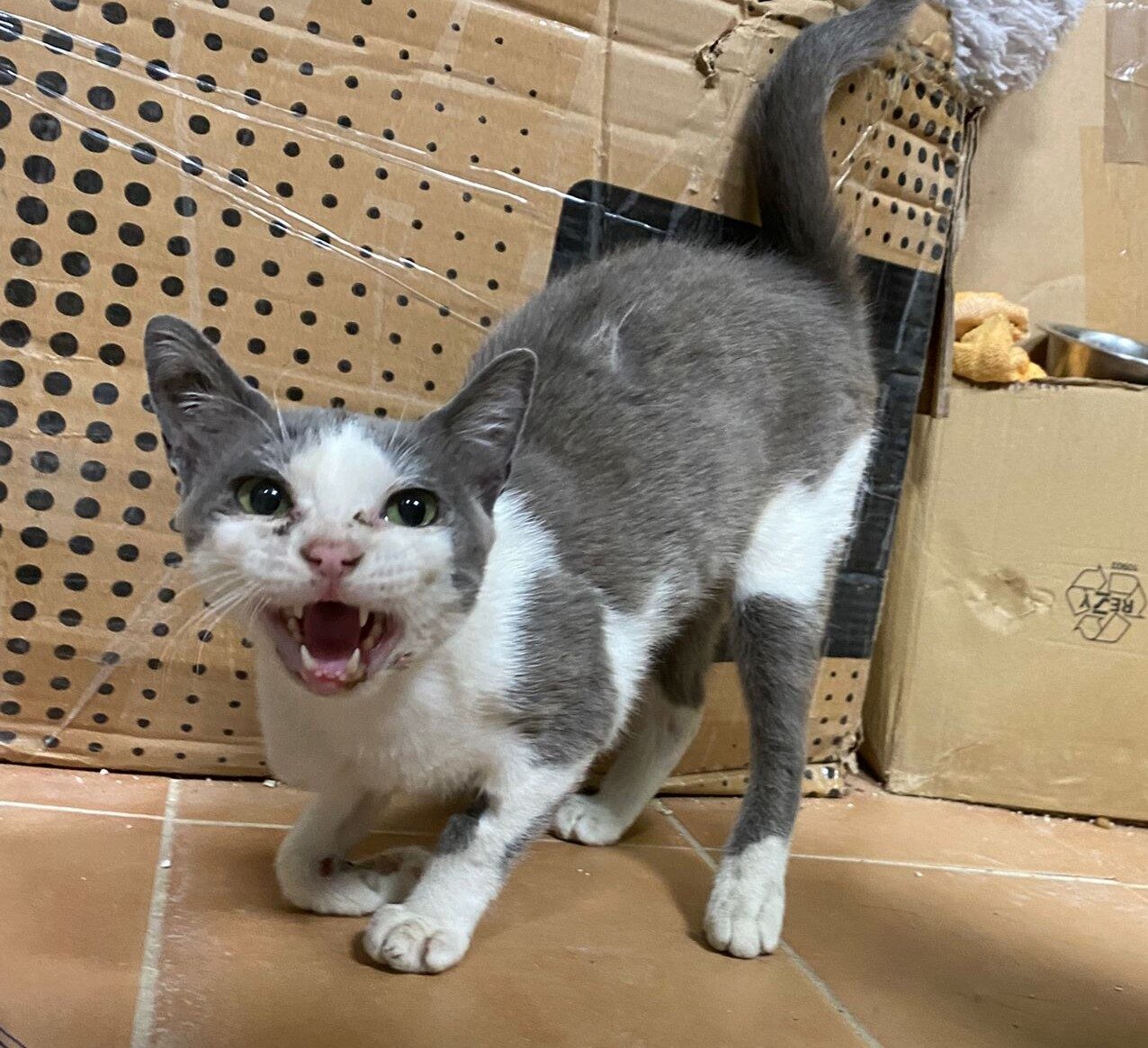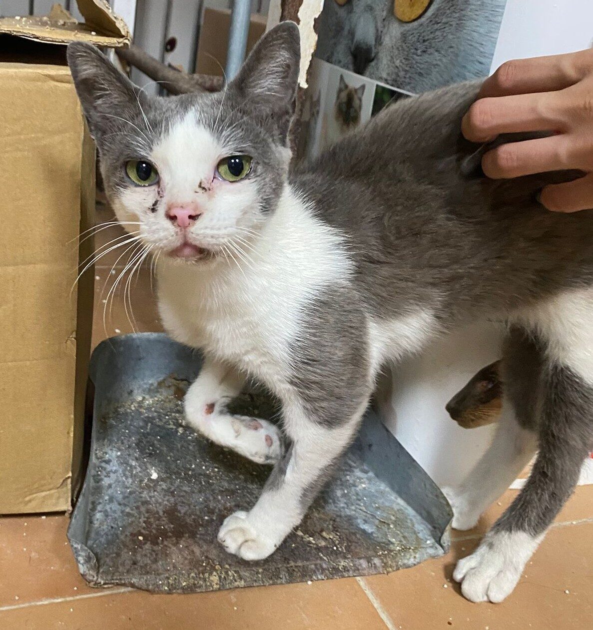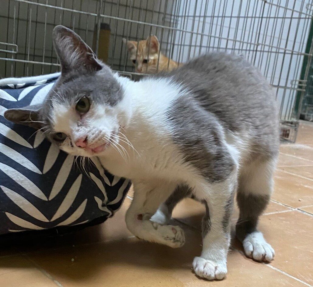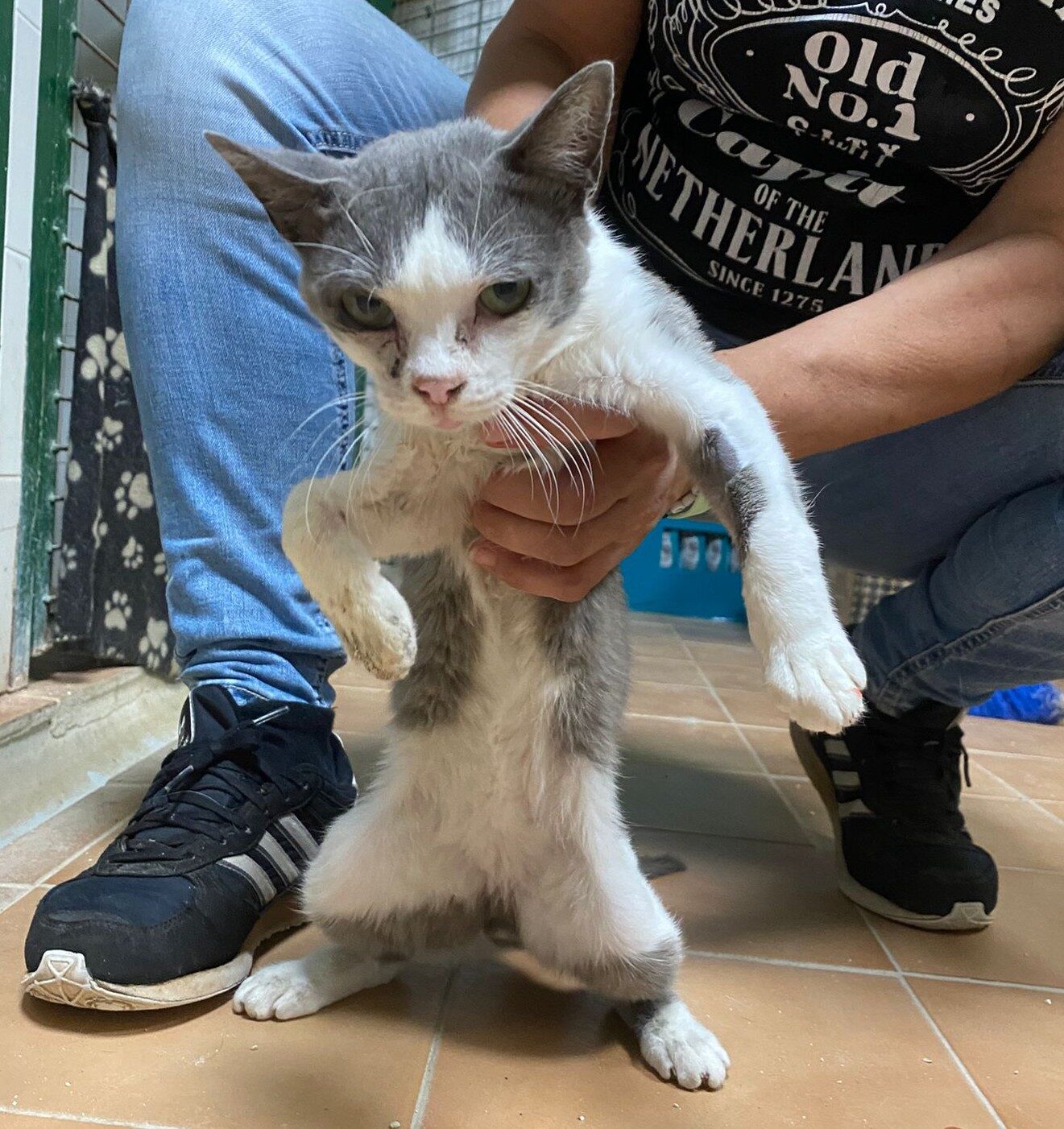 Der kleine Kater kam mit einem Beinbruch in die Obhut der spanischen Tierschützer. Da der Bruch schon alt war, konnte er nicht gerichtet werden.