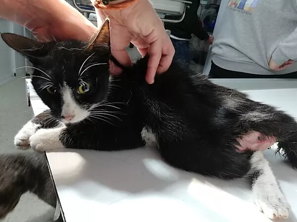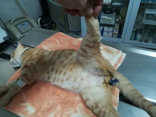 In Spanien gab es leider schon wieder den nächsten Notfall. Dieser kleine Kater musste operiert werden und man hat ihm den Penis amputiert und einen Art Vagina konstruiert. Der Kleine konnte keinen Urin ablassen. Für die dicke Beule am Schwanzansatz gibt es im Moment keine Erklärung.