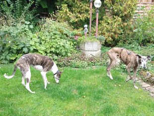 Aus dem neuen Zuhause grüßt auch Salina. Sie ist zu einem anderen Galgo gezogen und wie ihr sehen könnt fühlt sie sich schon pudel-, Verzeihung: galgo-wohl. Der Garten wird ausgiebig erkundet und das Sofa ist erobert.