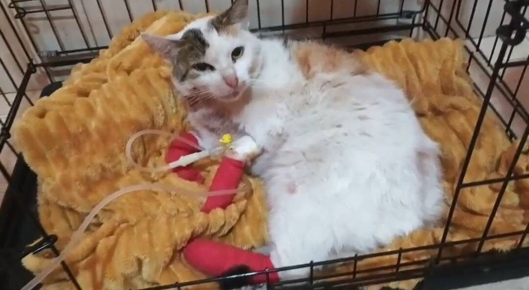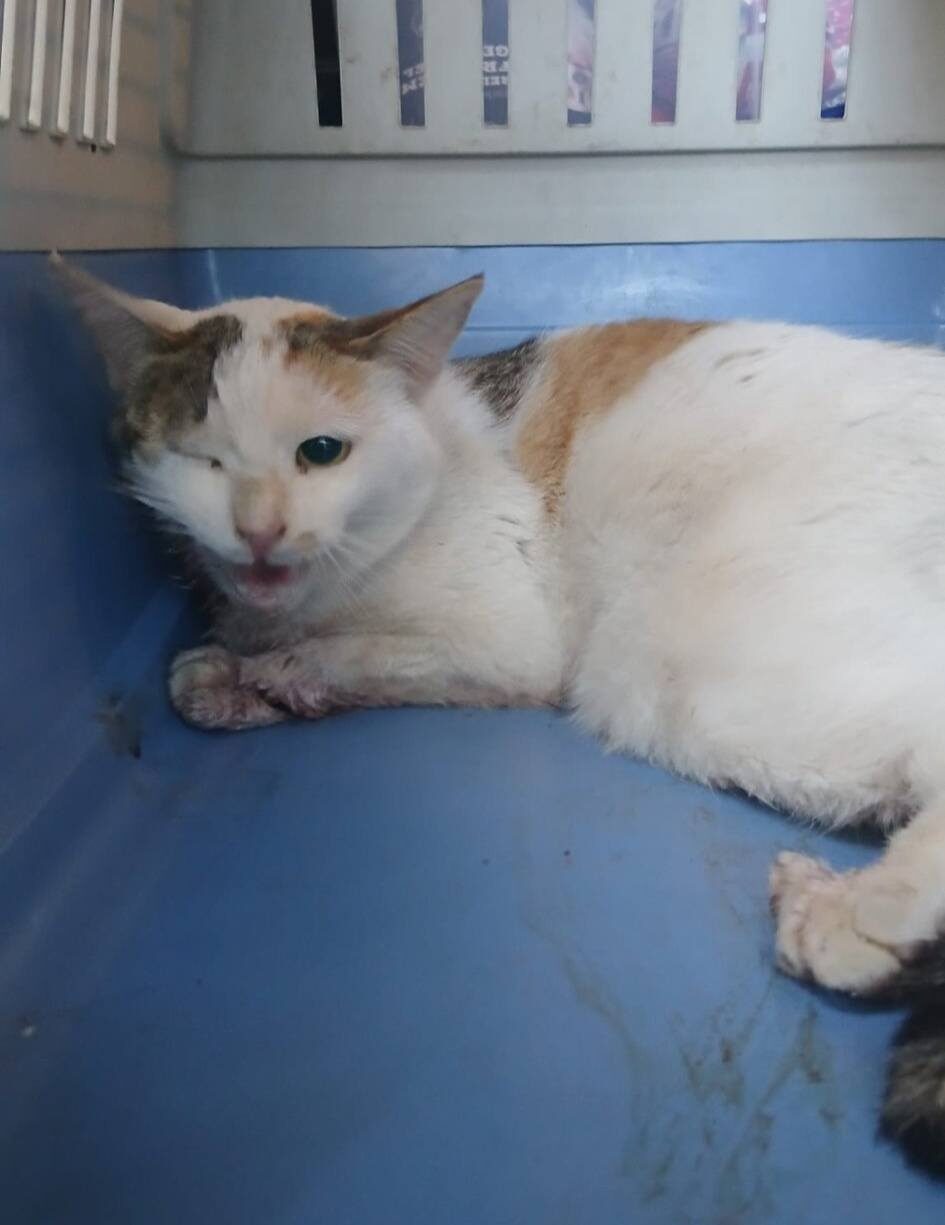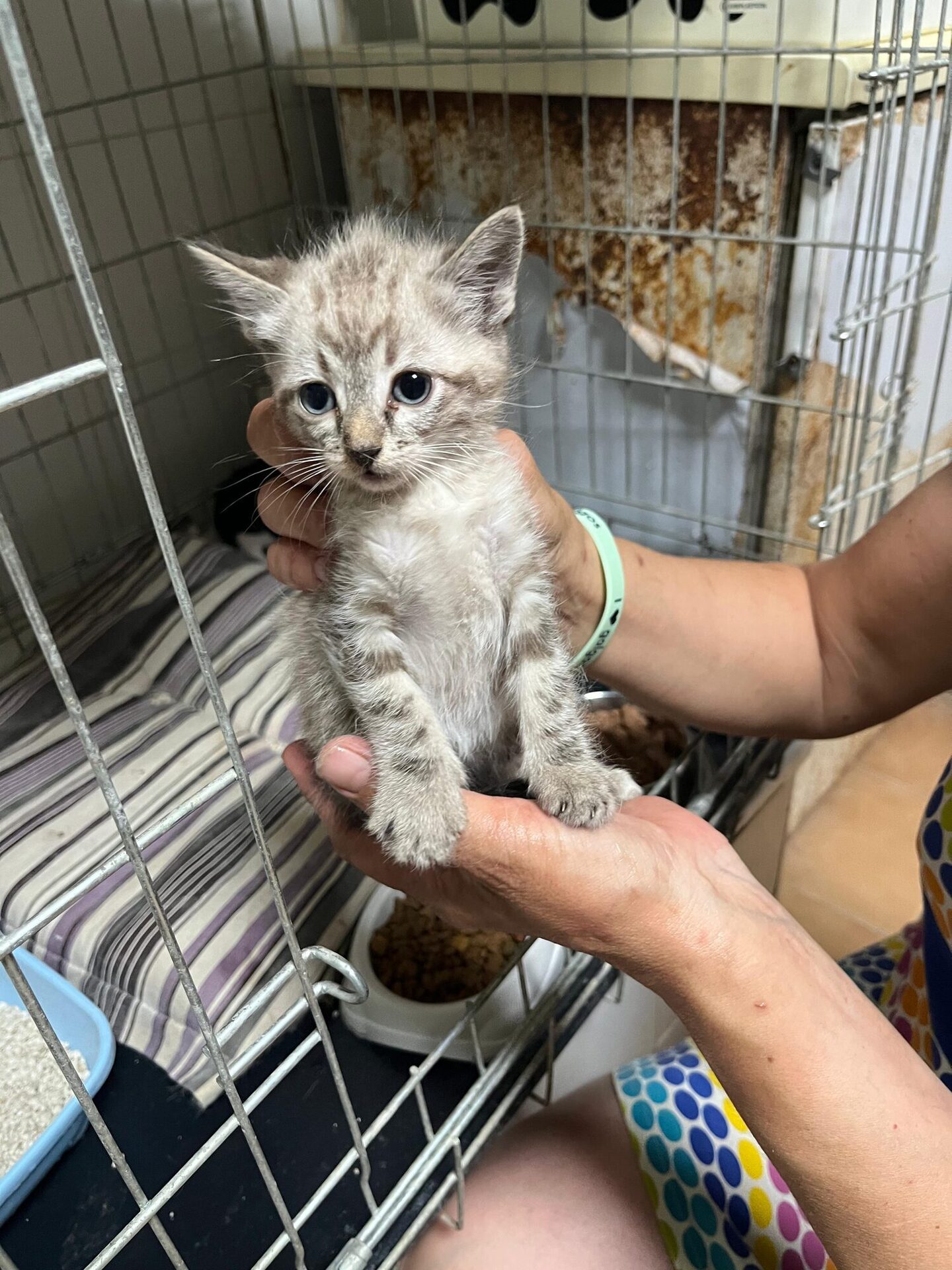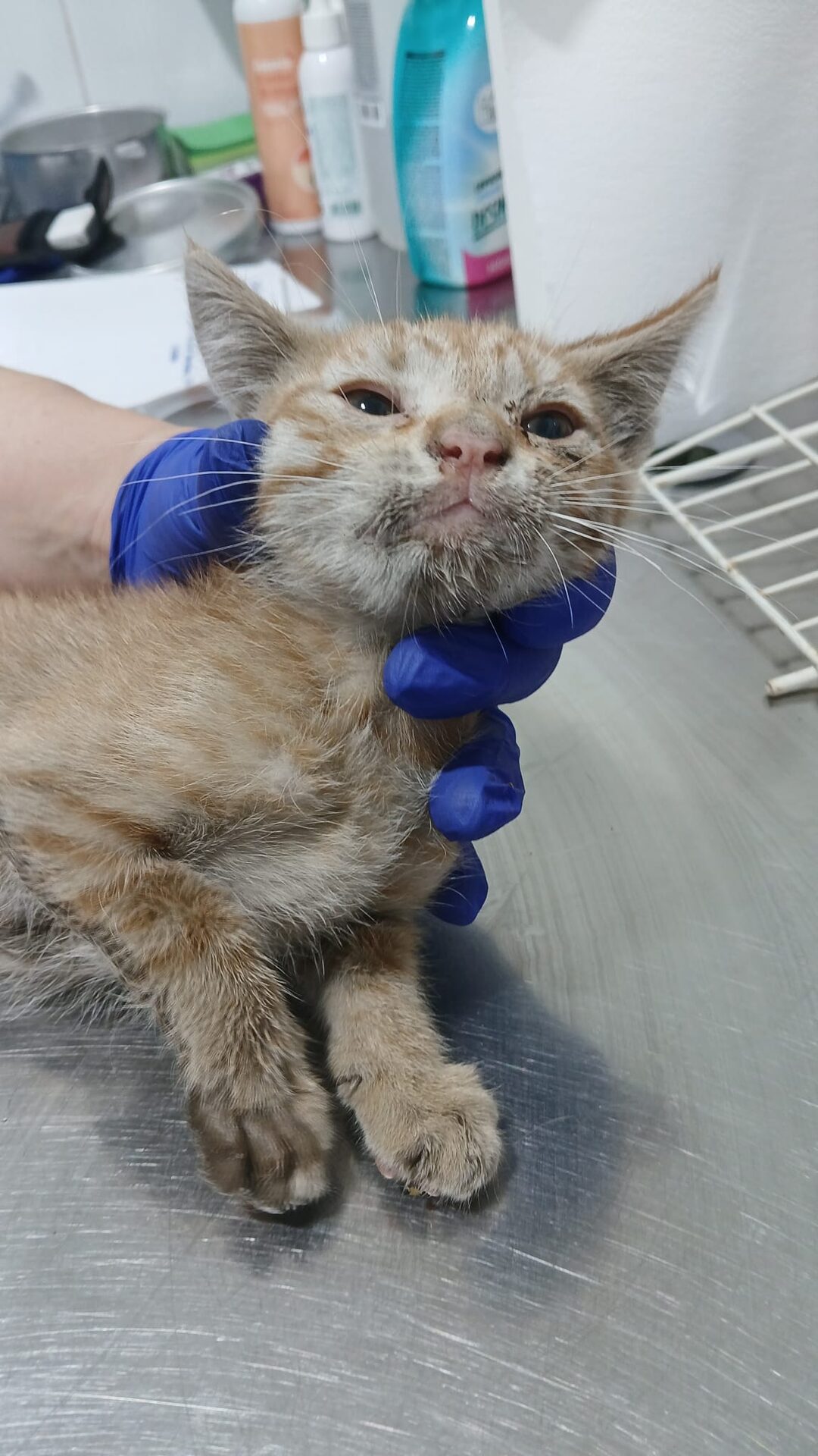 Schwerverletzt kam dieses Kätzchen in die Perrera. Ihre Beinchen müssen irgendwo eingeklemmt gewesen sein. Die Verletzungen schon so schlimm, dass zwei Beinchen teilamputiert werden mussten. Das Kätzchen ist bei der Tierärztin und wird dort versorgt.