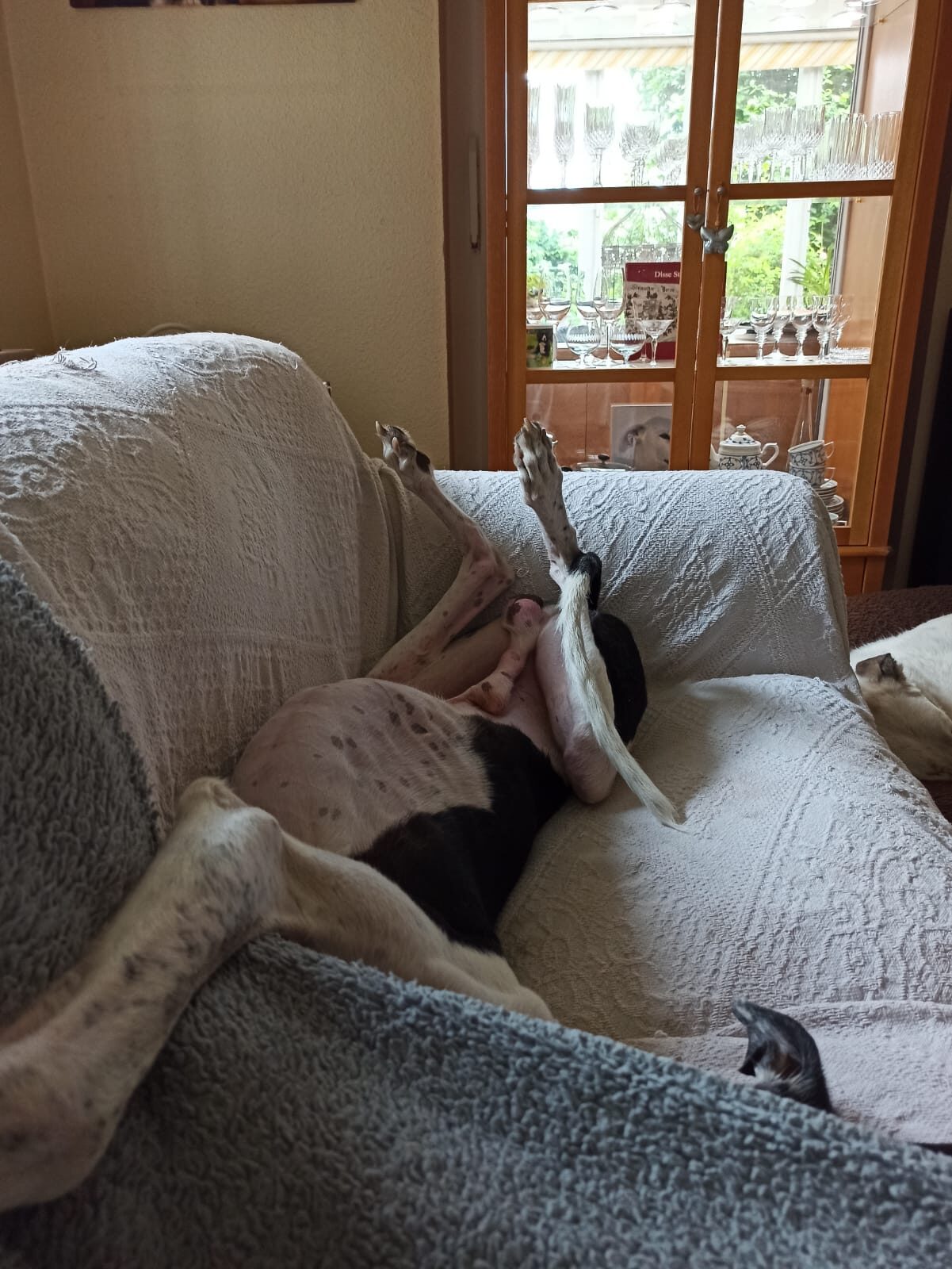 Tornado konnte letzten Monat auf eine Pflegestelle nach Deutschland reisen und erstaunte uns alle. Sofort hat er den Körperkontakt mit seinem Pflegefrauchen gesucht. In der Wohnung fühlte sich der hübsche Galgomann sicher. Die ersten Tage wollte er diese auch nicht verlassen. Stück für Stück erkundete er dann den Garten und geht mittlerweilen auch spazieren. Leevi wie er jetzt genannt wird ist noch weit davon entfernt ein souveräner Hund zu sein, aber er lernt sehr schnell und sein Vertrauen in den Menschen wurde nicht komplett zerstört.