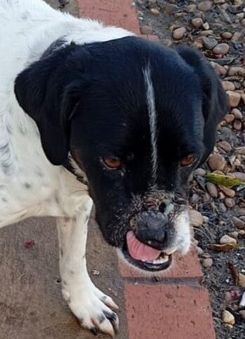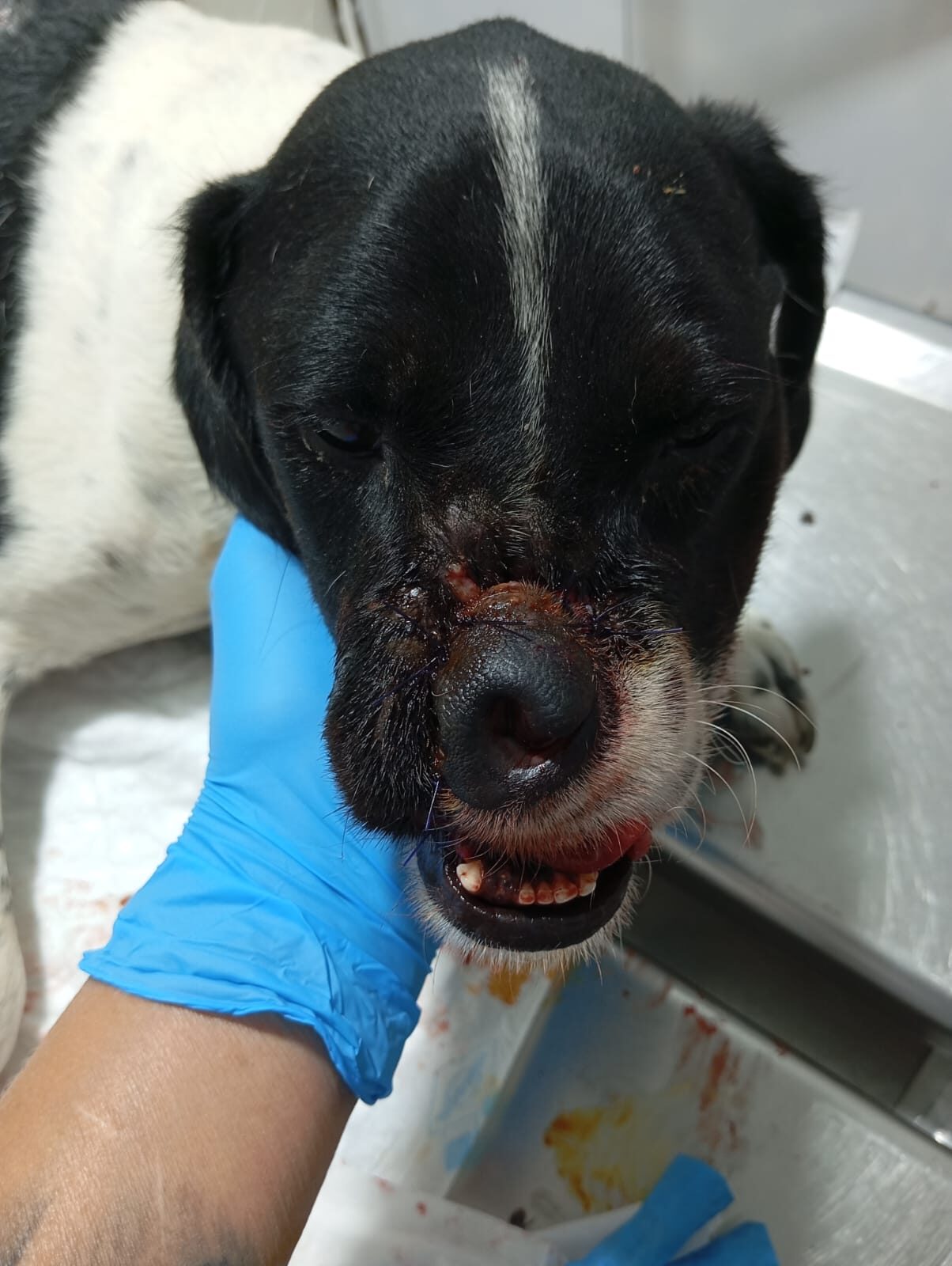 Beethoven ist eines unserer Sorgenkinder, wenn nicht DAS Sorgenkind. Als der Rüde gefunden wurde klaffte eine riesen Wunde in seinem Gesicht, Nase und ein Teil des Oberkiefers hingen nur noch an einem kleinen Stück Fleisch. Wie es zu dieser Verletzung gekommen ist, das wissen wir leider nicht. Es deutet allerdings alles darauf hin, dass es sich um Gewalteinwirkung handelt.